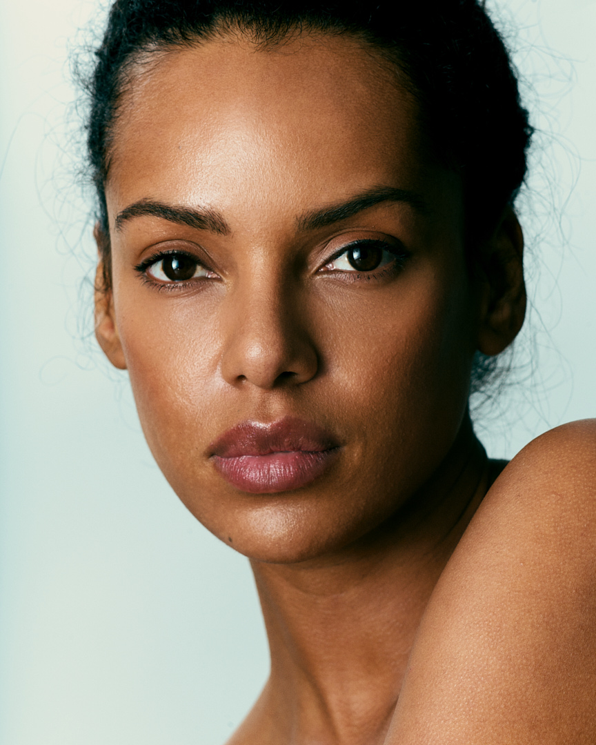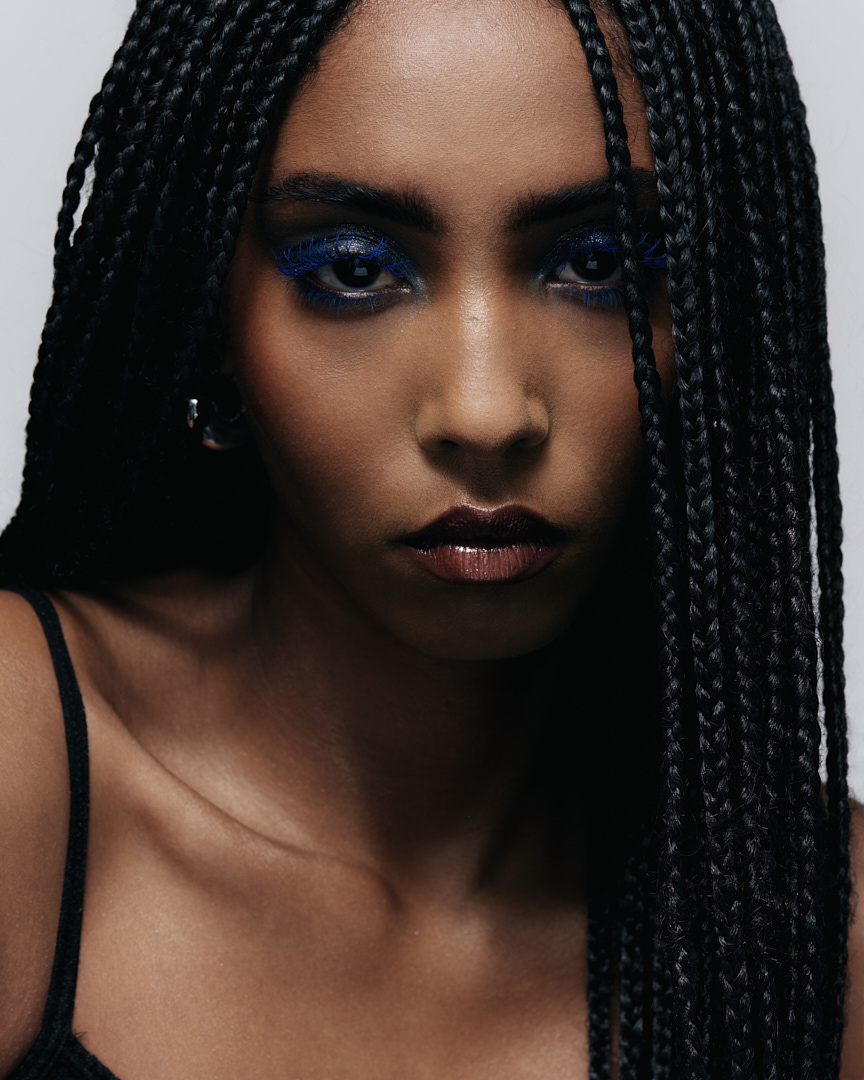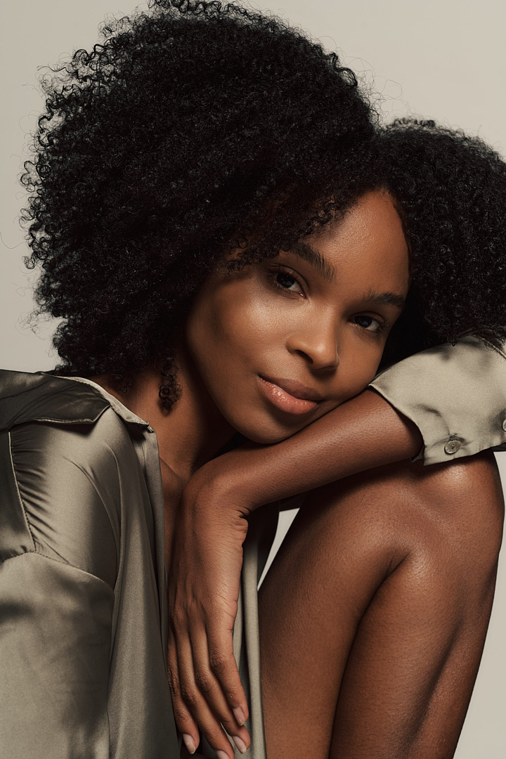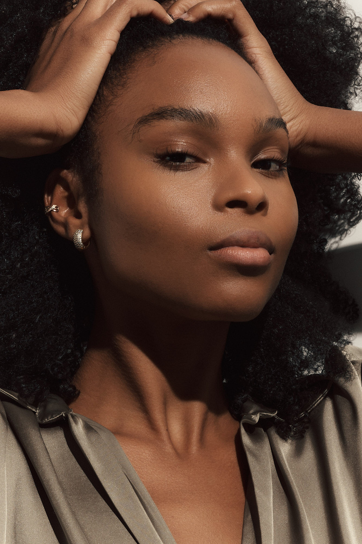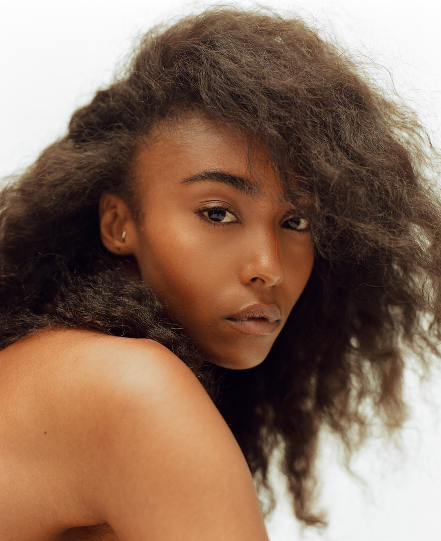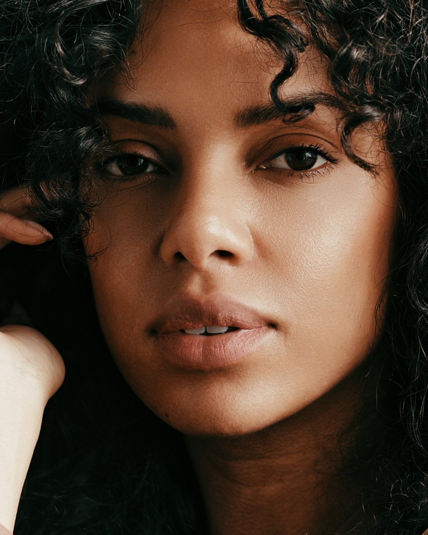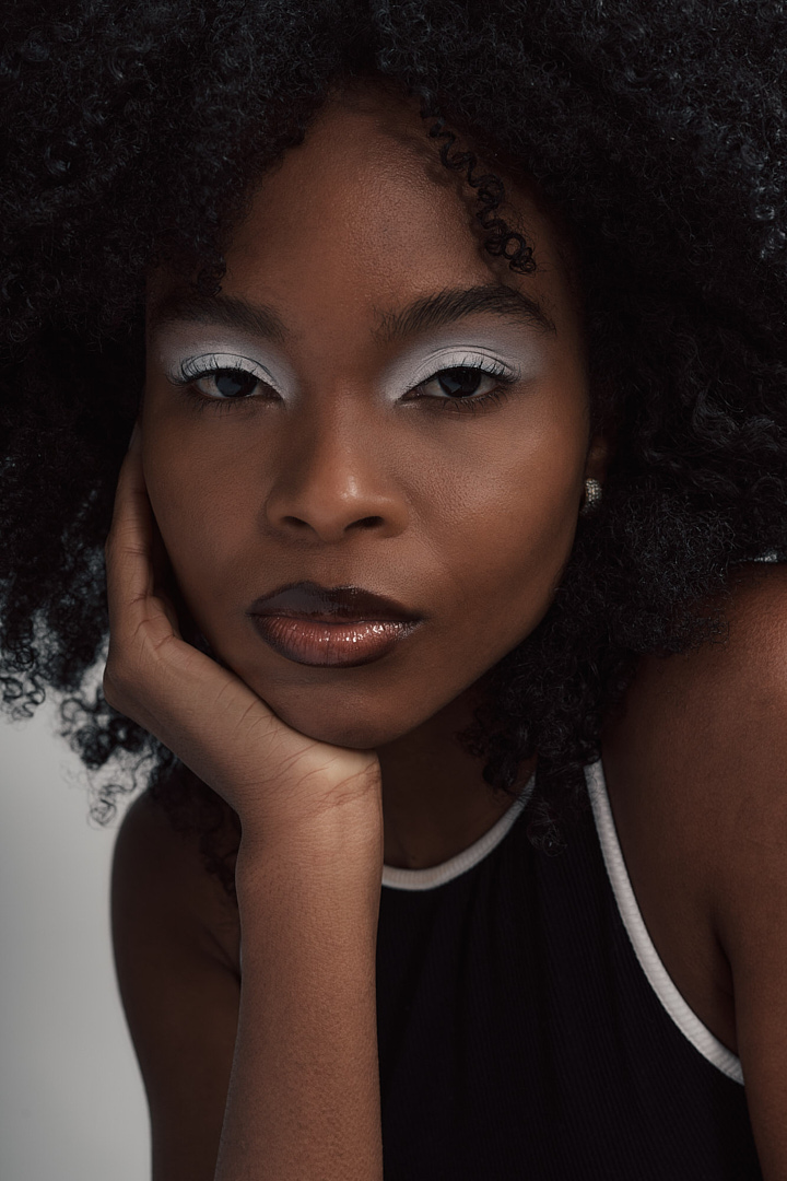 Close-up portrait of a person with dark skin and short hair against a plain light background