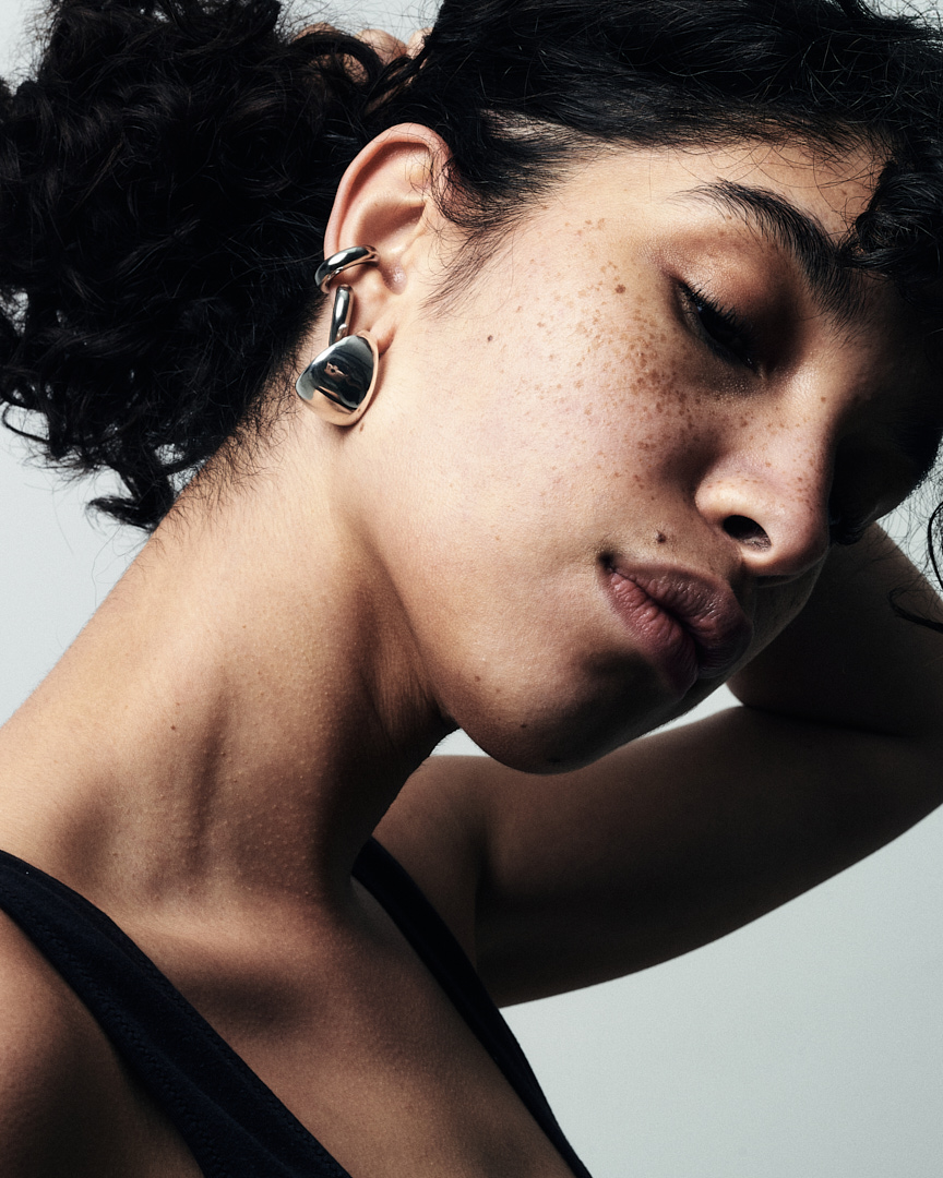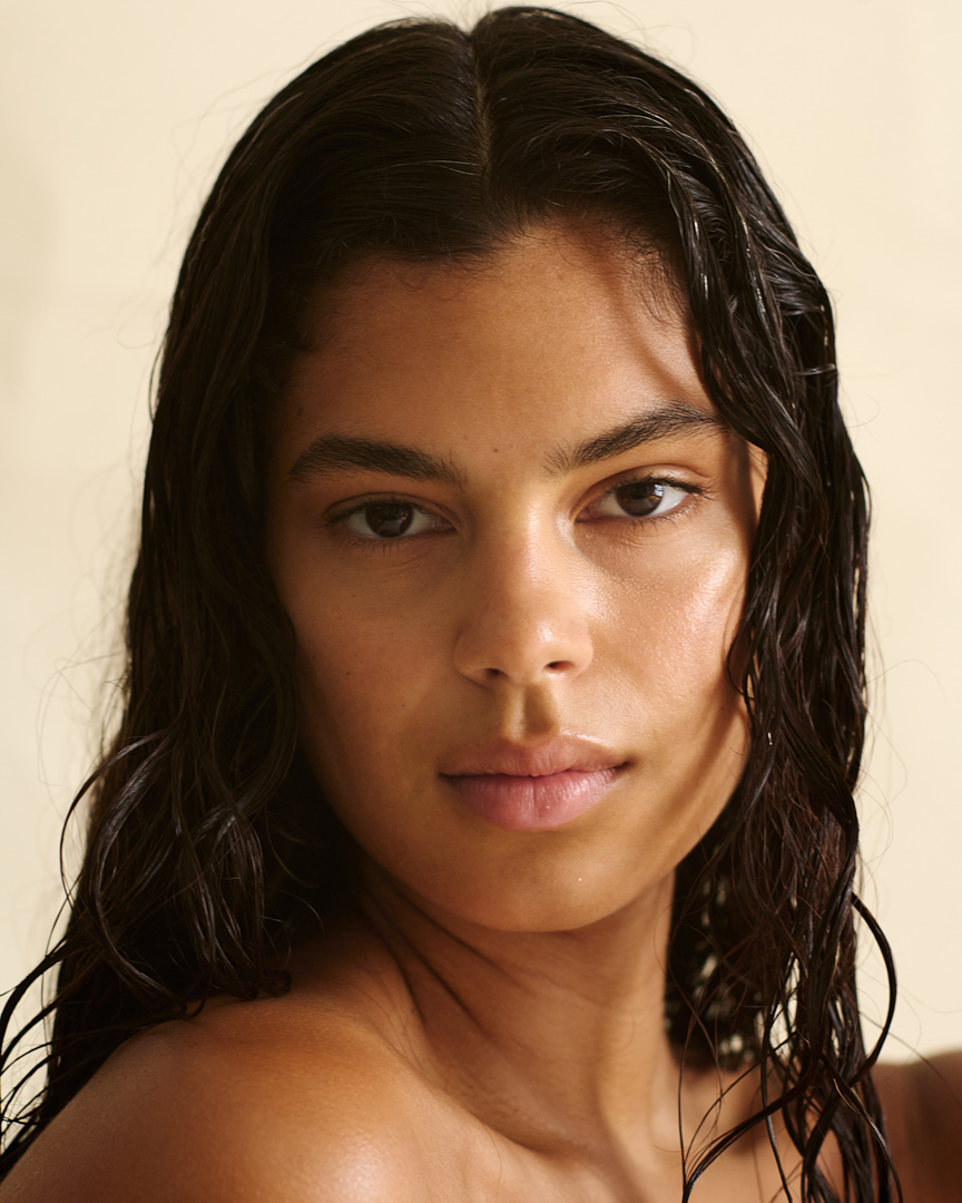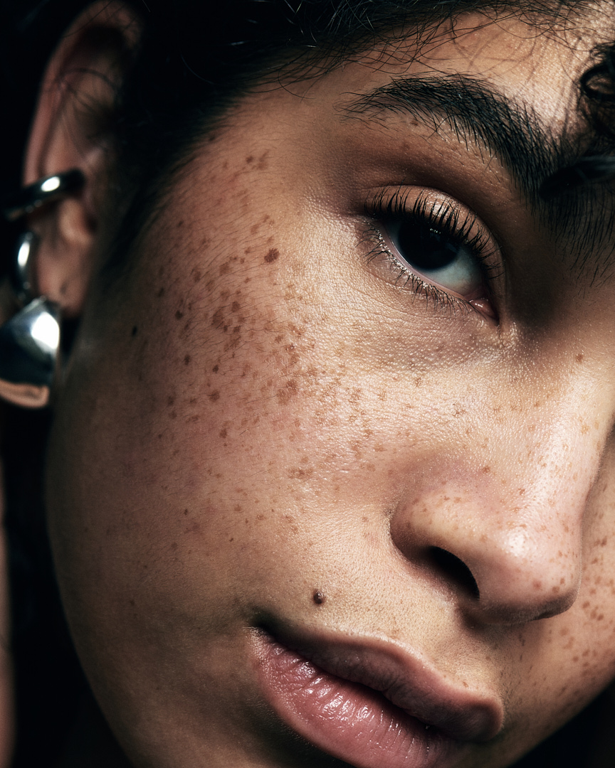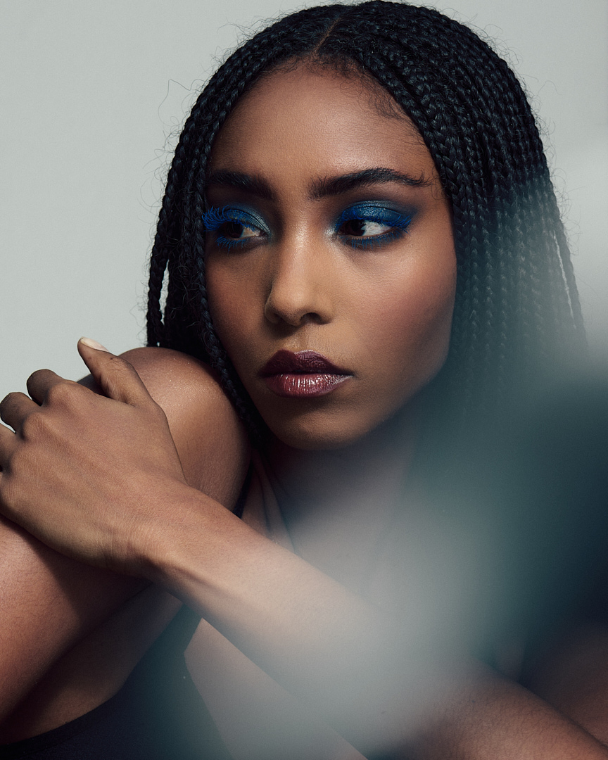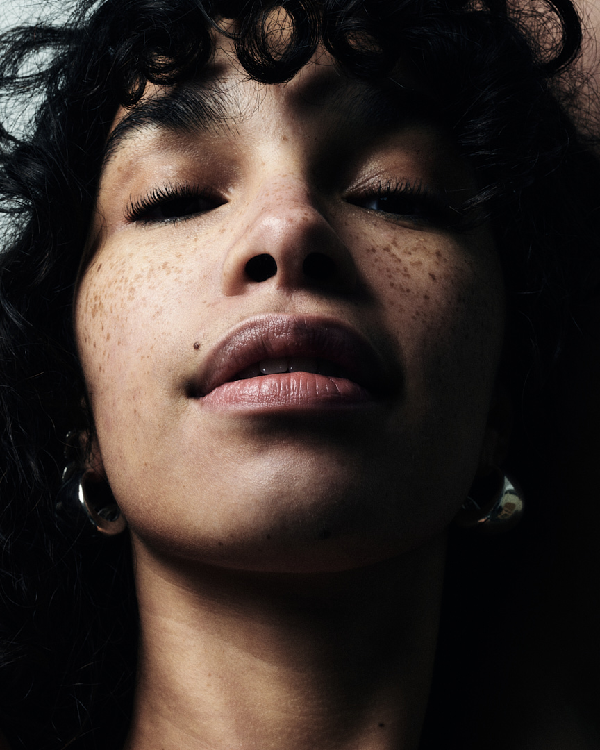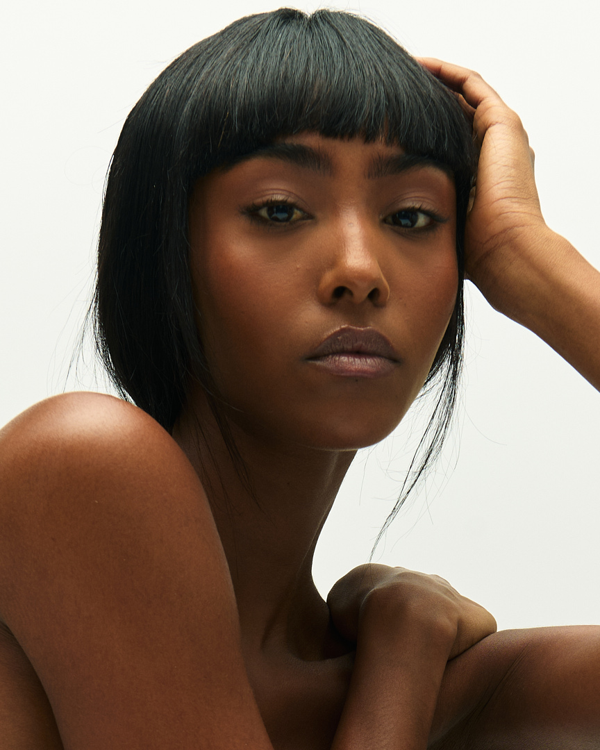 Close-up portrait of a person with dark skin and short hair against a plain light background