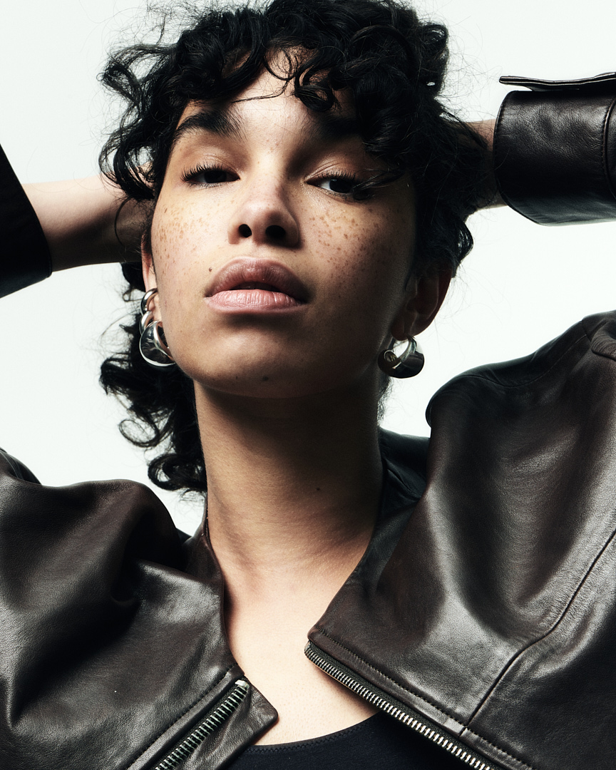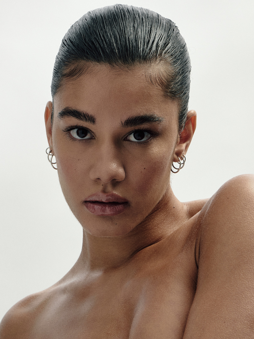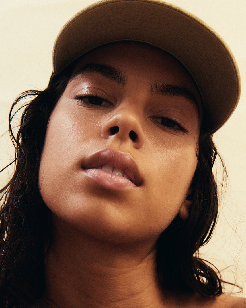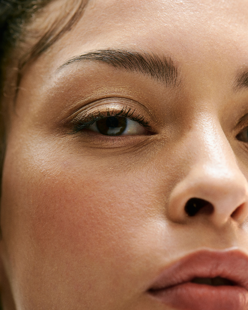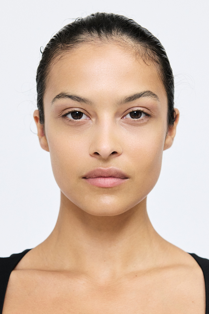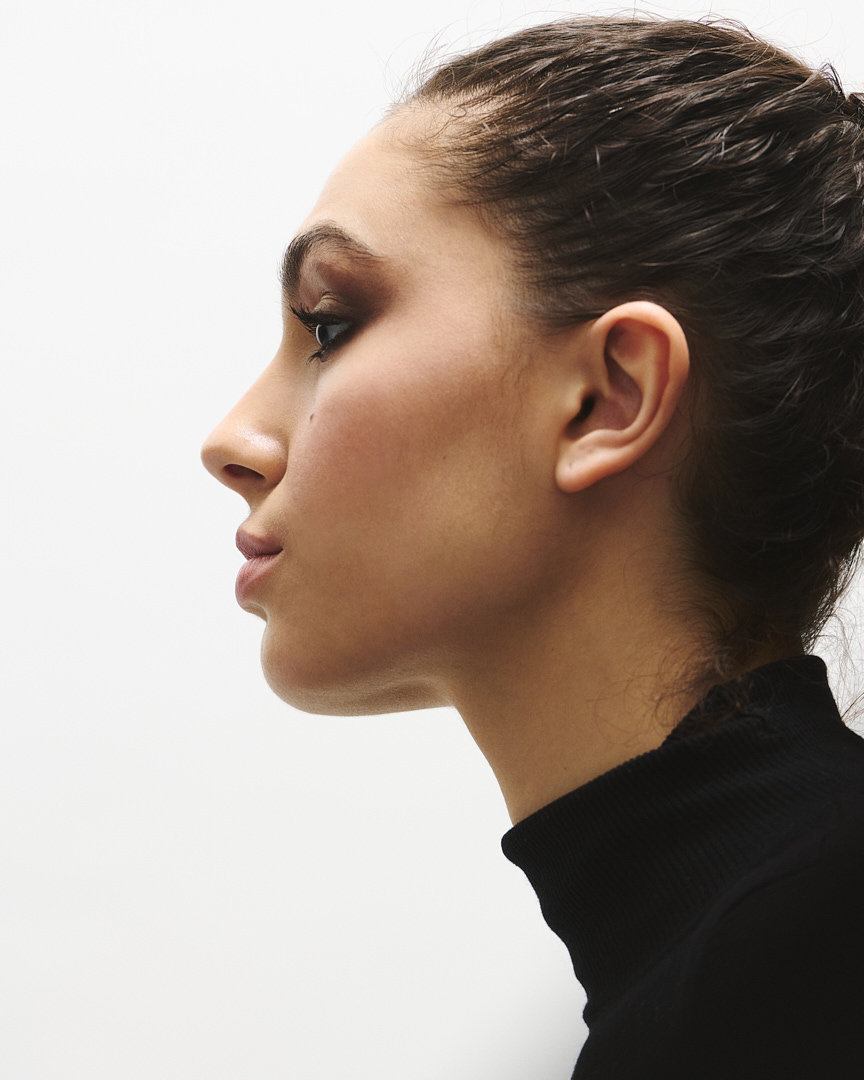 Close-up portrait of a person with dark skin and short hair against a plain light background