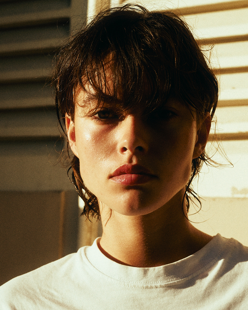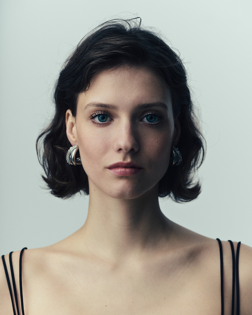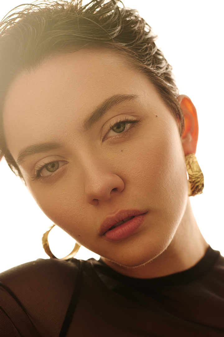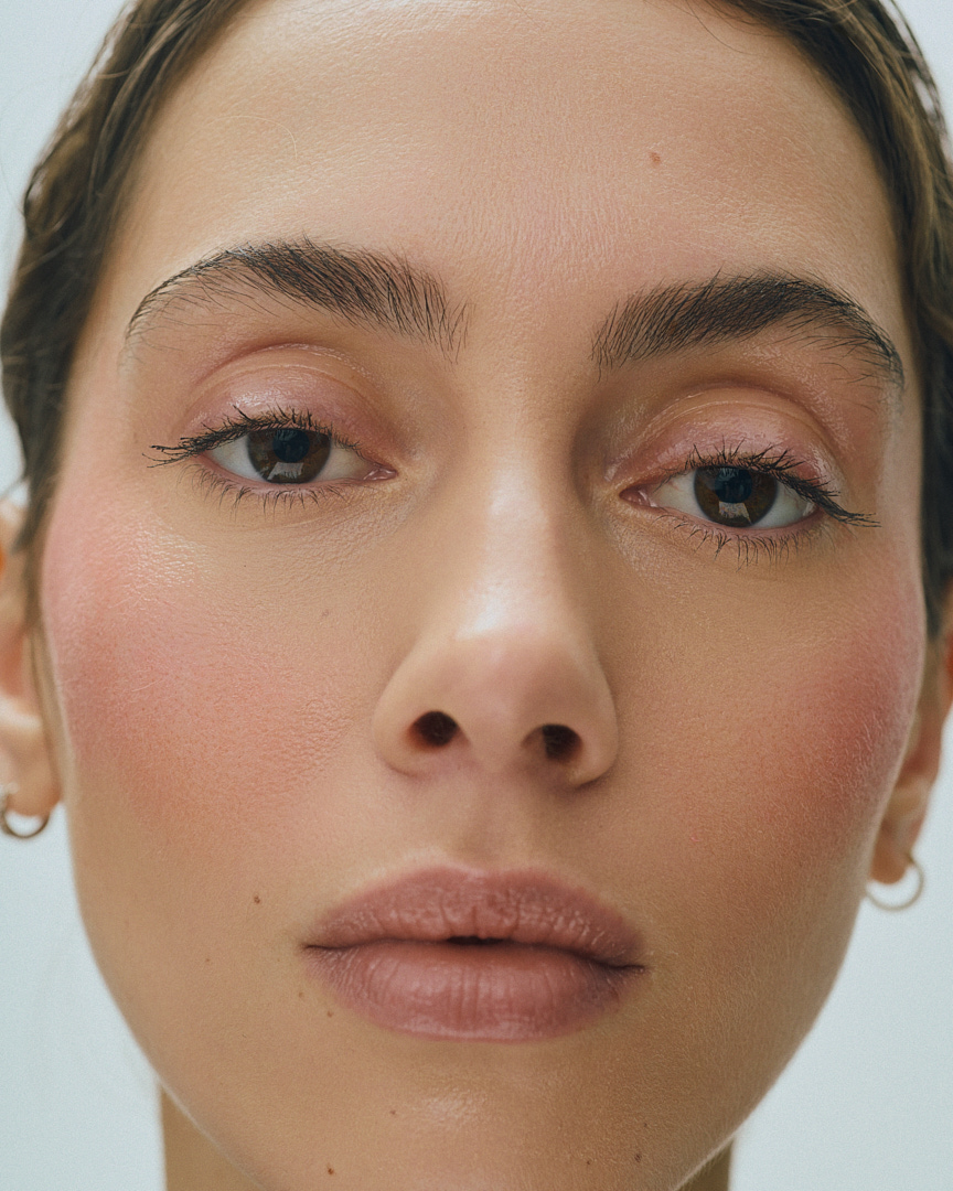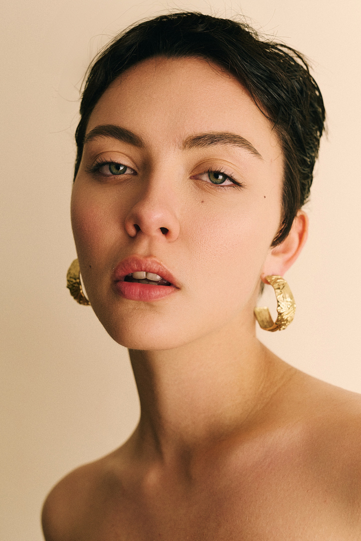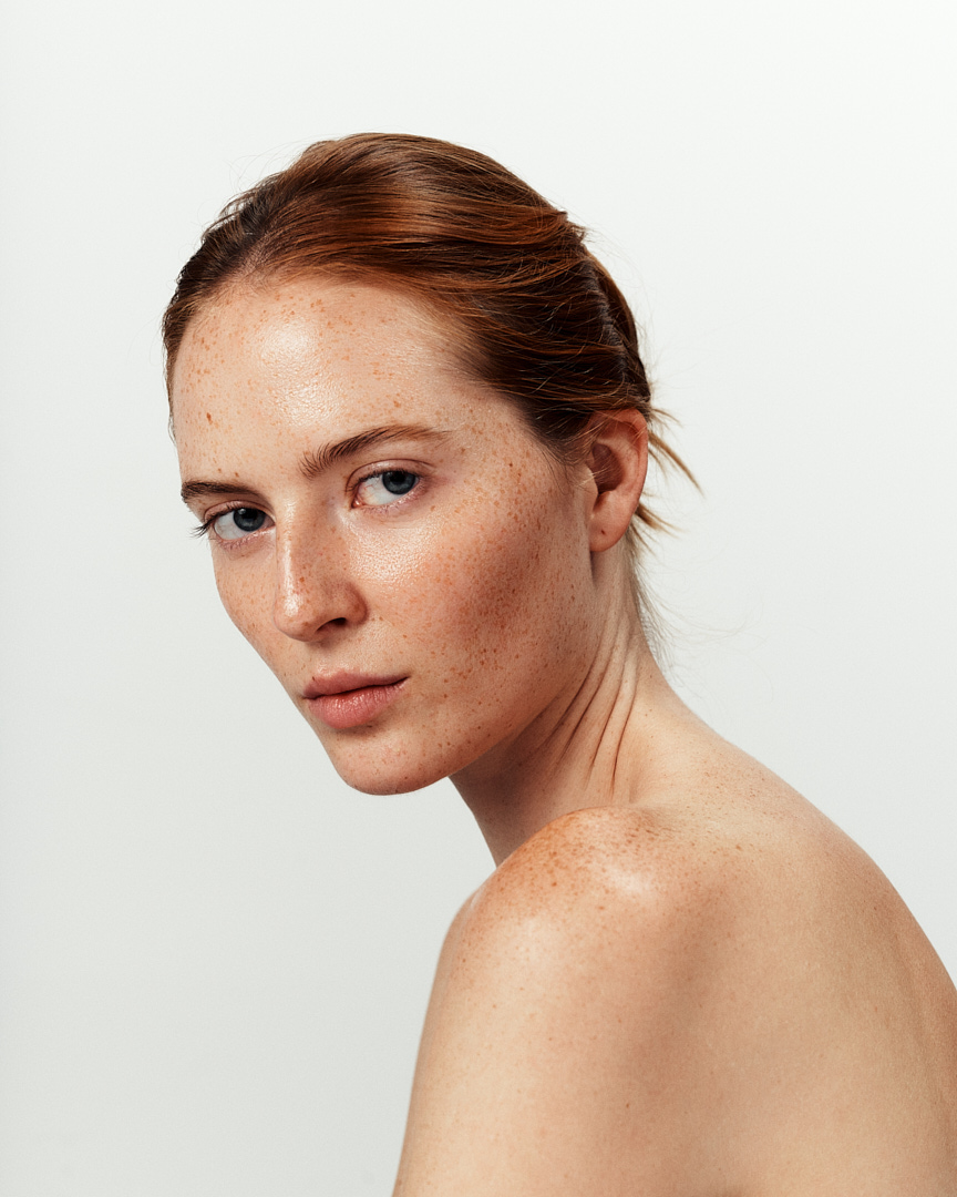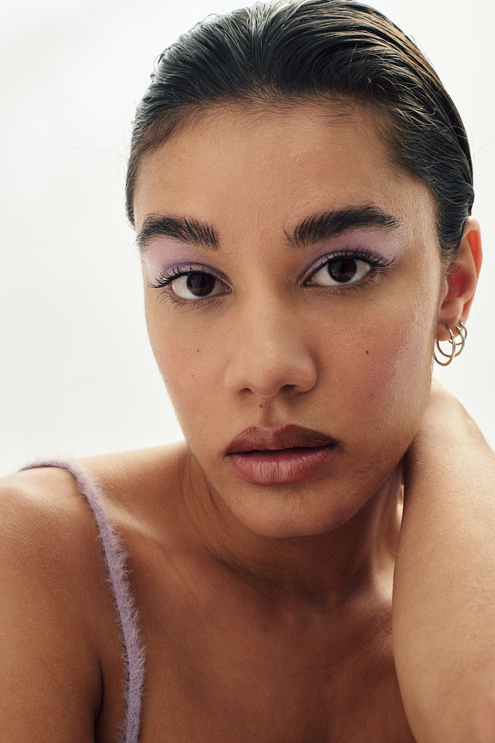 Close-up portrait of a person with dark skin and short hair against a plain light background