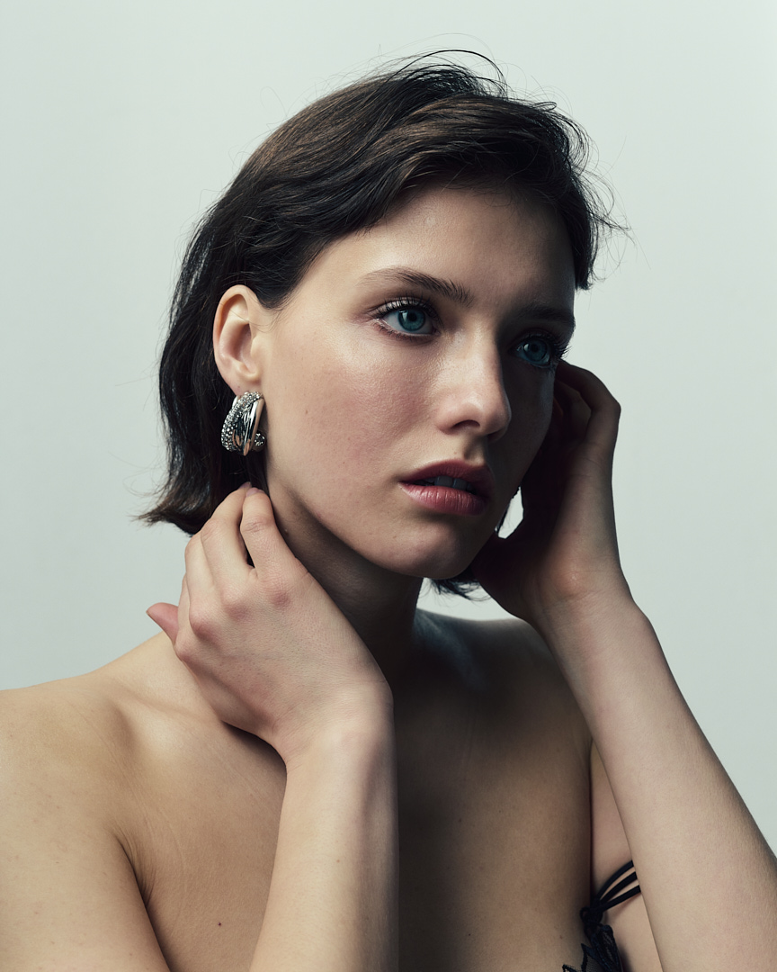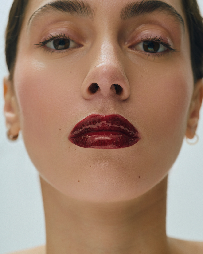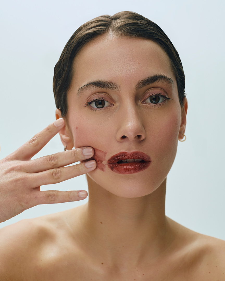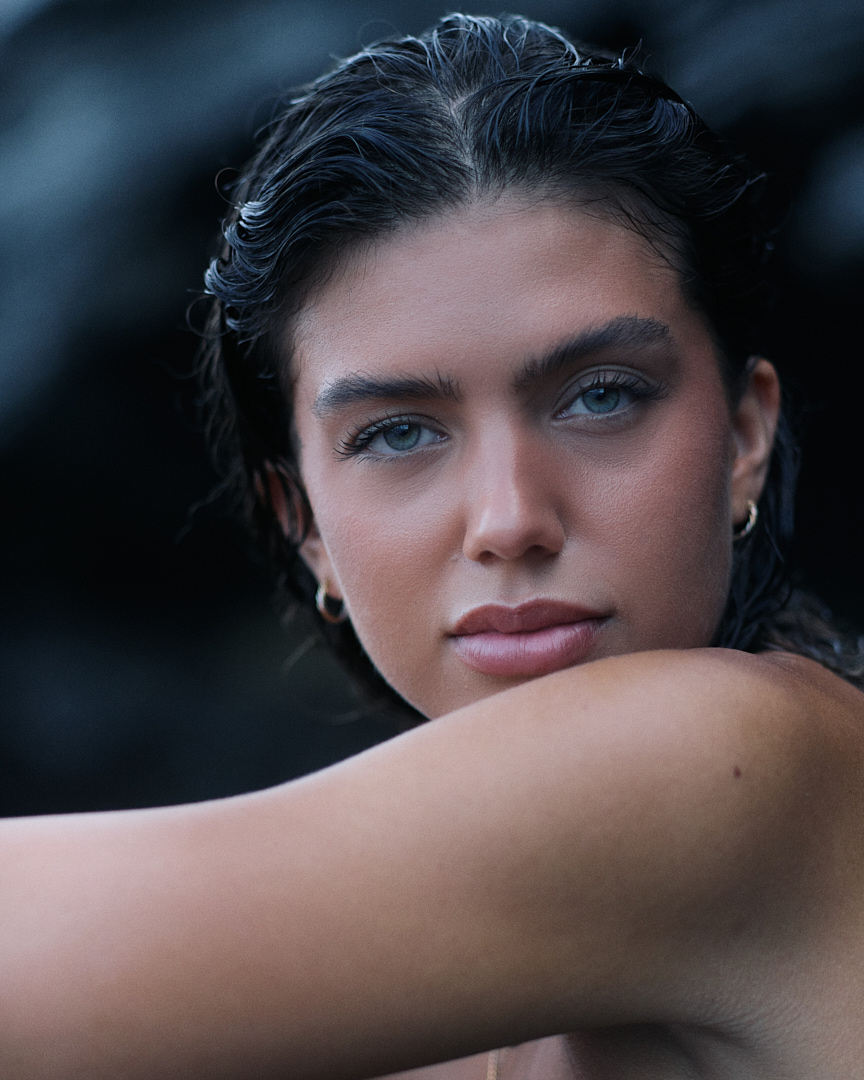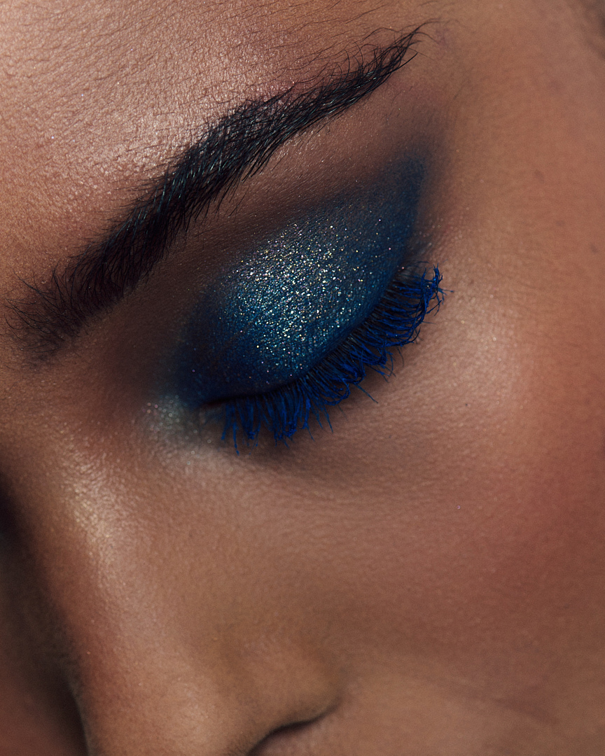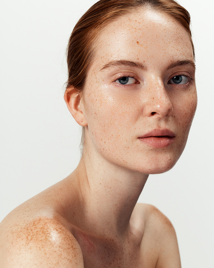 Close-up portrait of a person with dark skin and short hair against a plain light background