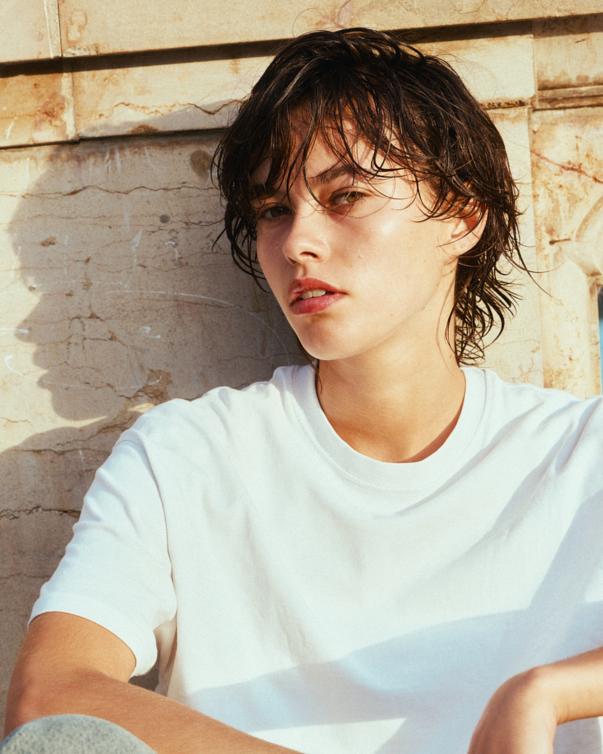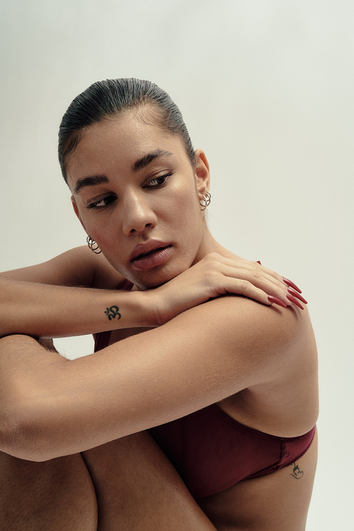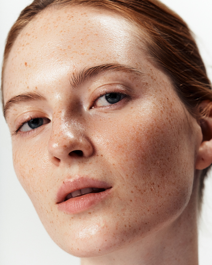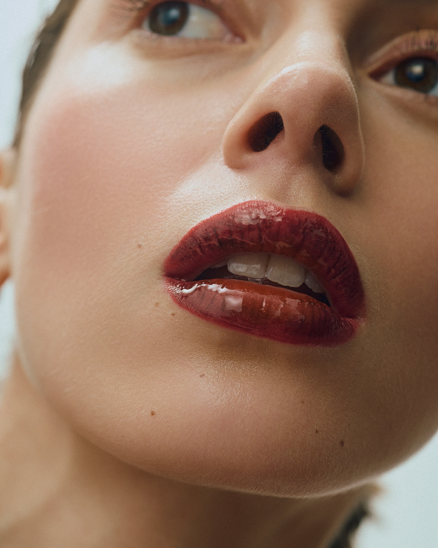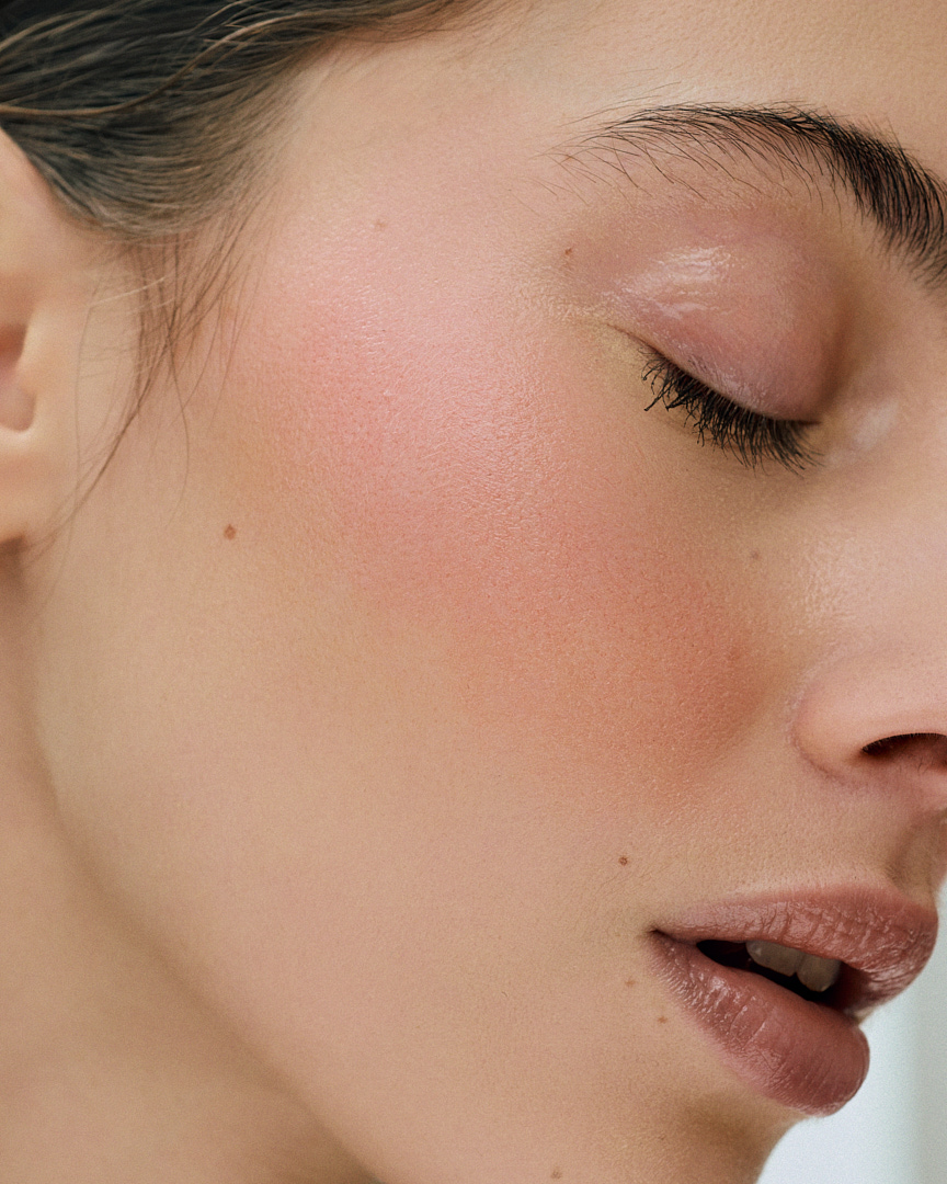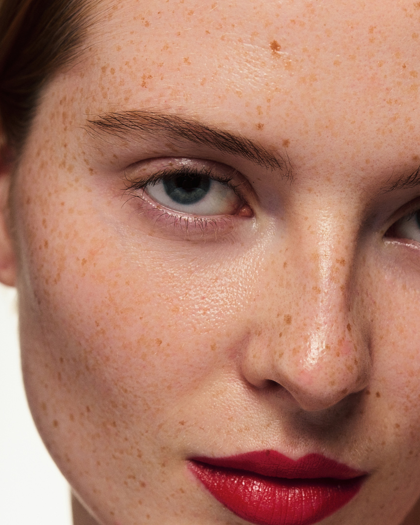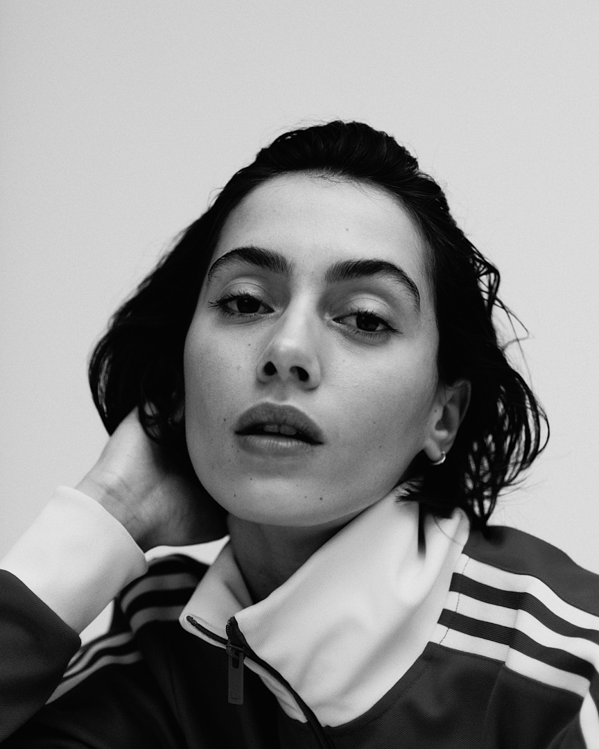 Close-up portrait of a person with dark skin and short hair against a plain light background