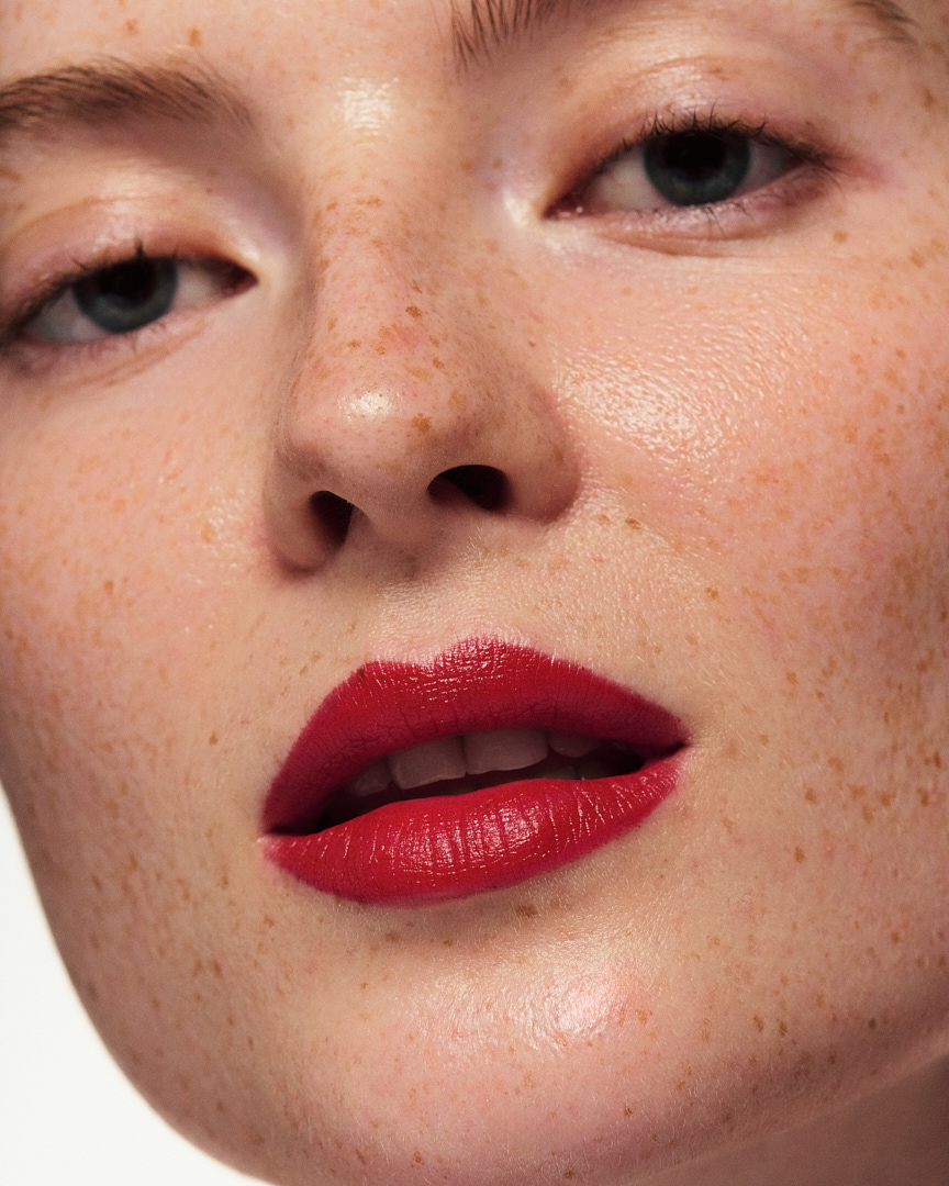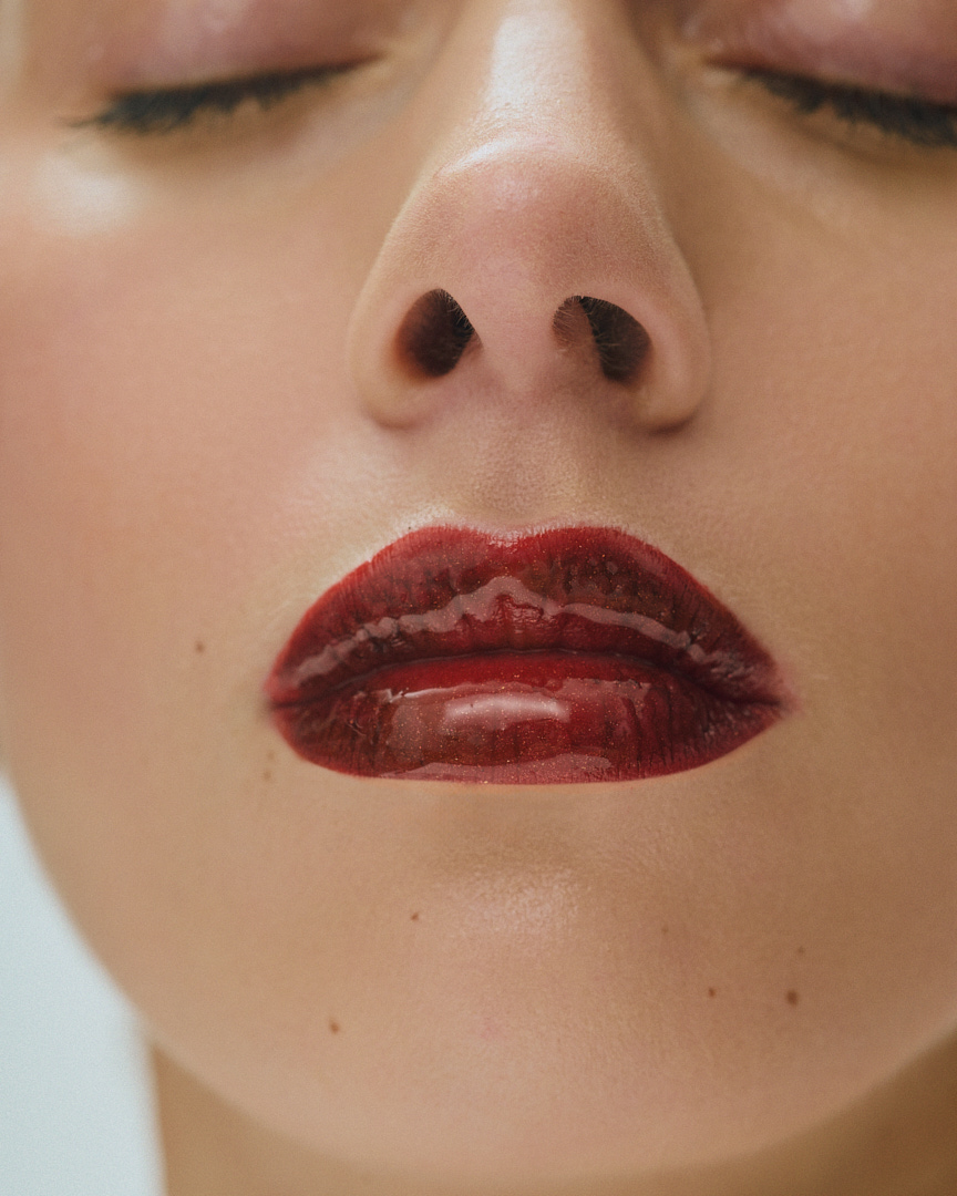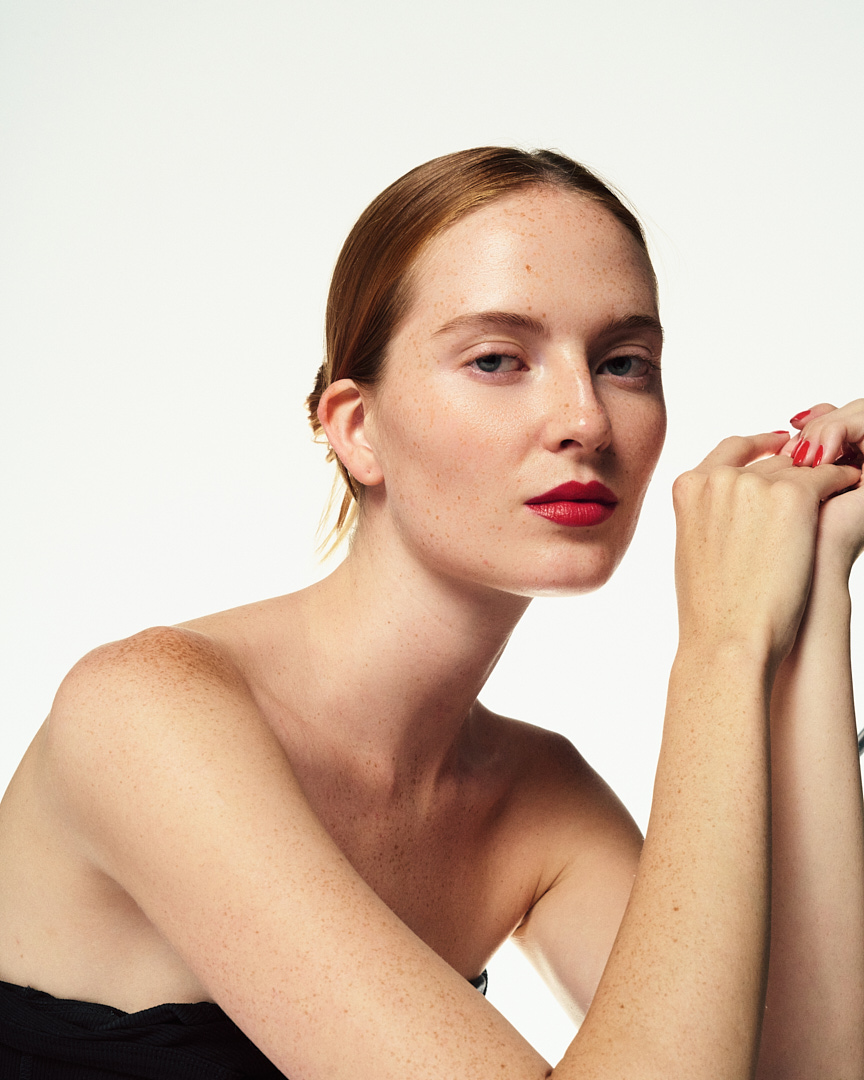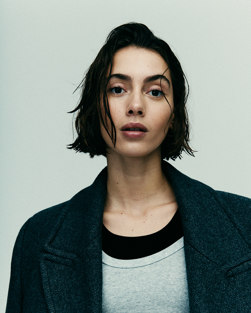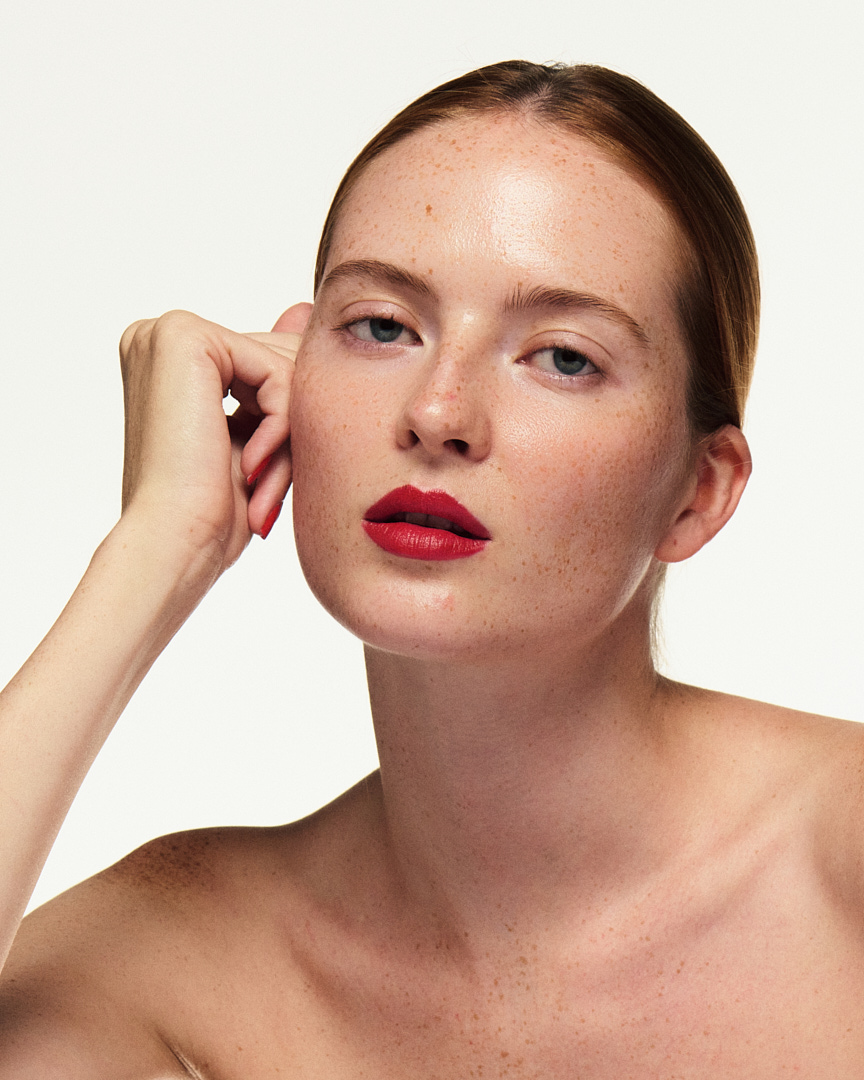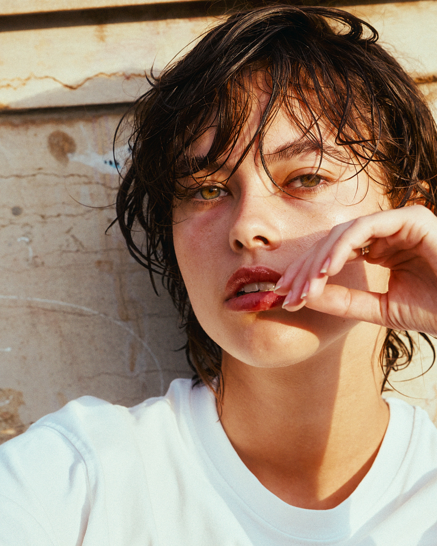 Close-up portrait of a person with dark skin and short hair against a plain light background