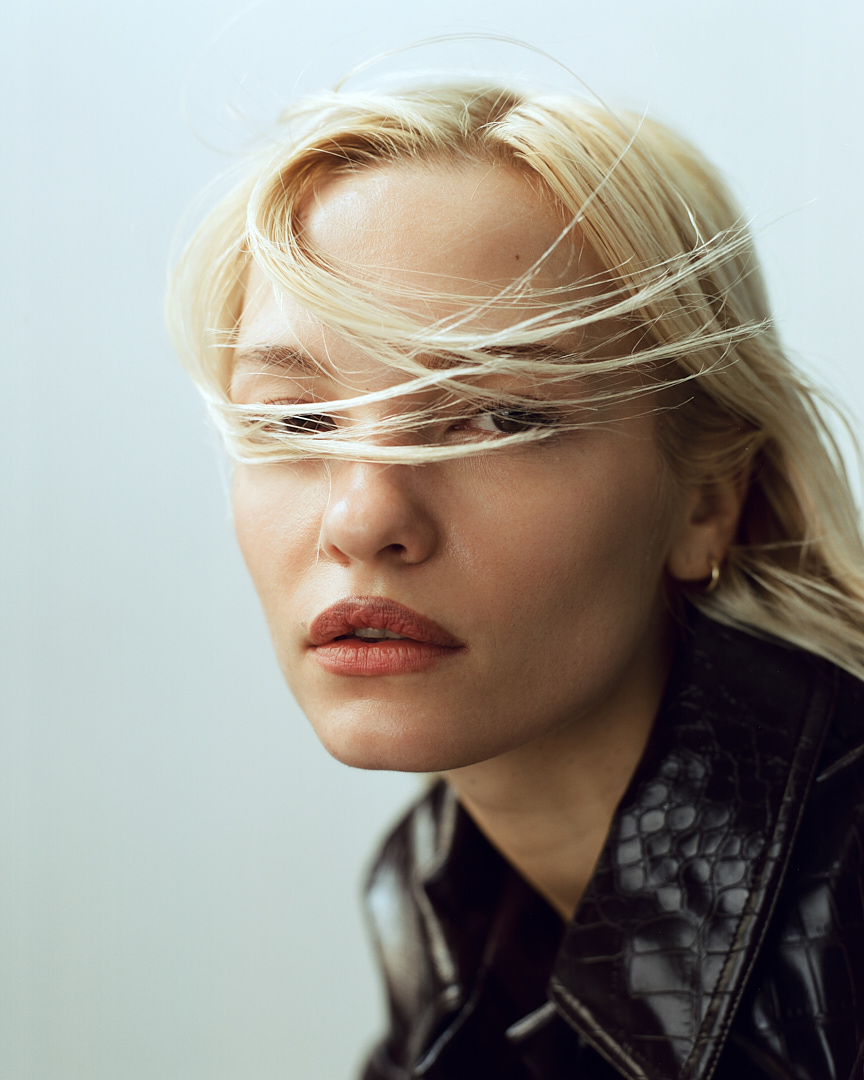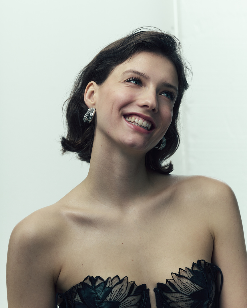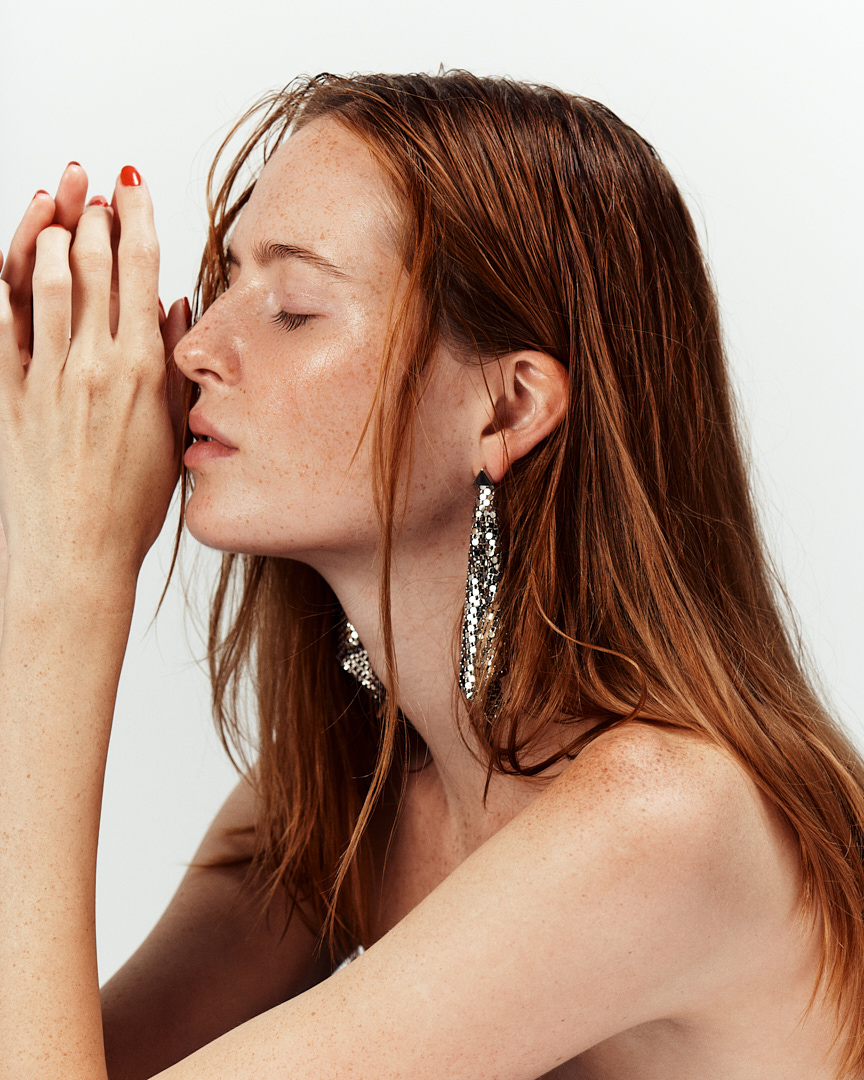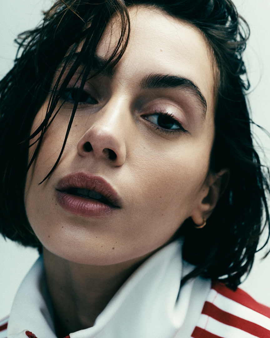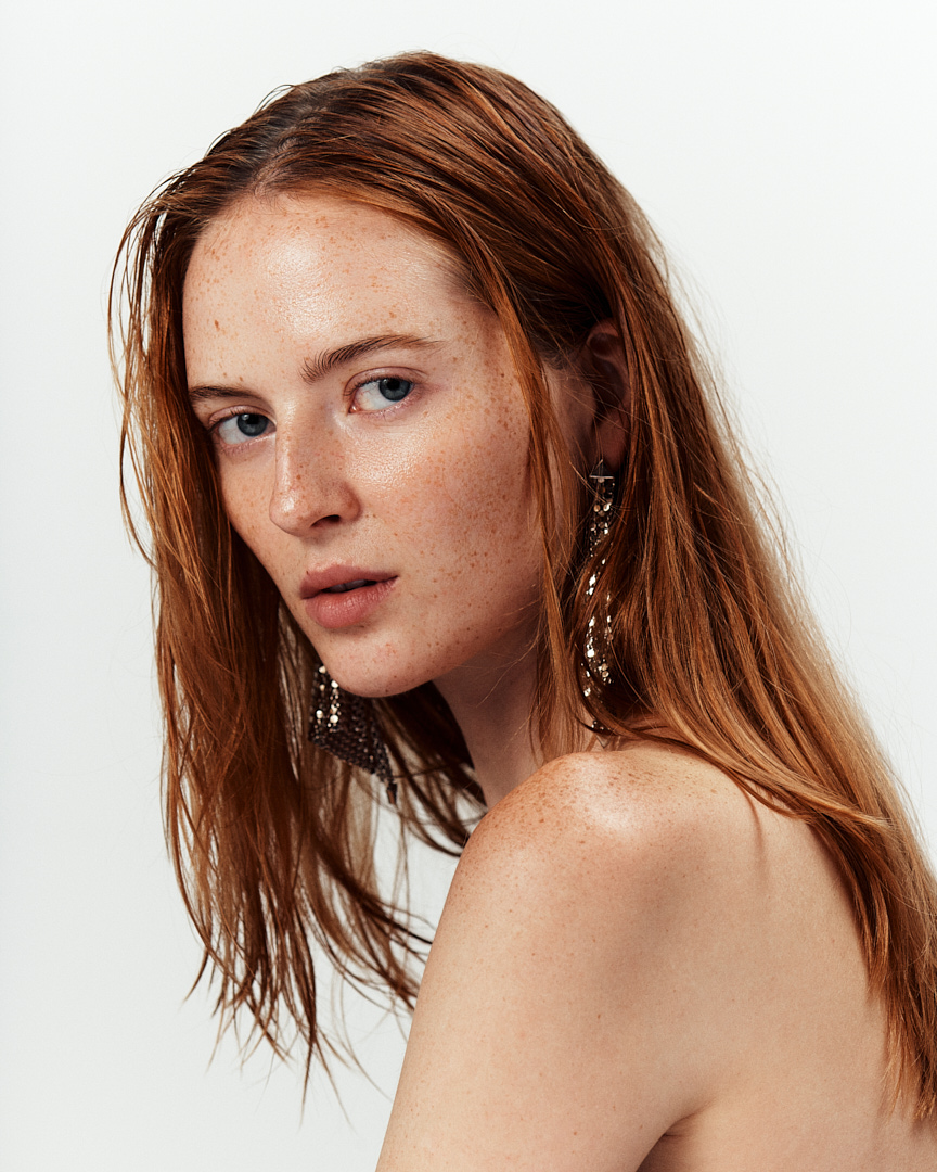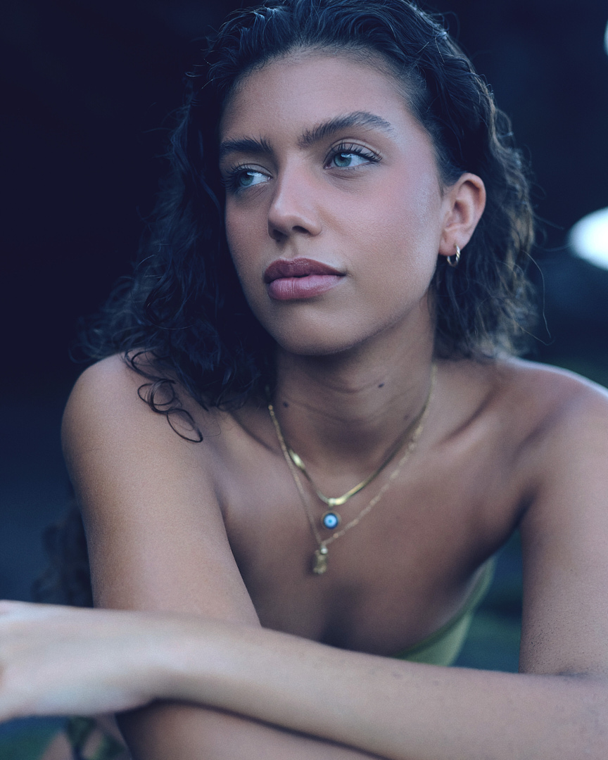 Close-up portrait of a person with dark skin and short hair against a plain light background